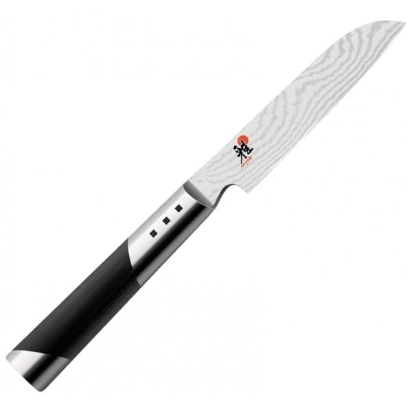 Klein en handig kuda-type groentemes uit Miyabi's 7000D serie. Het lemmet is gemaakt volgens de Damascus-methode met een harde CMV 60 staal in de kern omgeven door 32 lagen zachter staal aan elke kant en is onder een zeer steile hoek geslepen volgens de Honbazuke-methode.