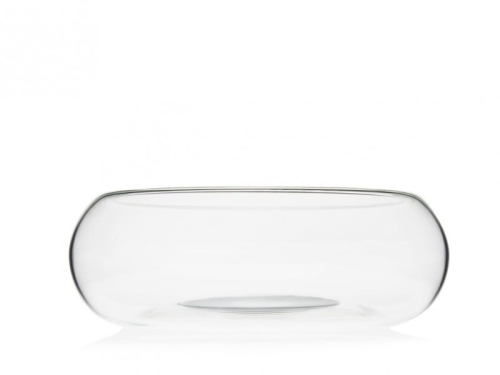 Een ellipsvormige glasplaat die in twee richtingen kan worden gebruikt in temperatuurbestendig borosilicaatglas. Perfect om effectief te serveren als je bijvoorbeeld droogijs gebruikt, want het is bestand tegen dat soort temperatuurveranderingen. Met de hand gemaakt.