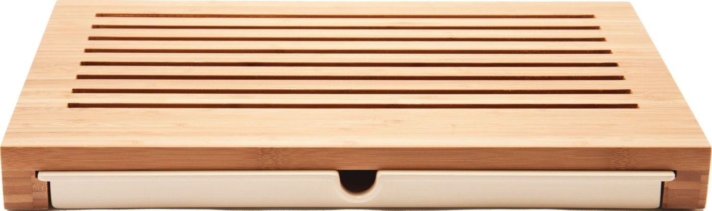 "Bamboe broodsnijplank met plastic kruimelopvangbakje. Afmetingen: 42 x 27 x (H) 4,5 cm Ontwerp: Anna & Gian Franco Gasparini"