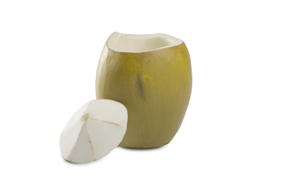 Cocktailglas, tikibarbeker of om ijs in te serveren - dit item is net zo veelzijdig als levensecht. Gemaakt van hars zijn de tokonomisten van 100% Chef erin geslaagd een groene kokosnoot te maken die week in, week uit groen blijft. Het deksel kan eraf en heeft een gat voor rietjes. Met de hand geschilderd door de eerder genoemde dwazen, met groot succes.