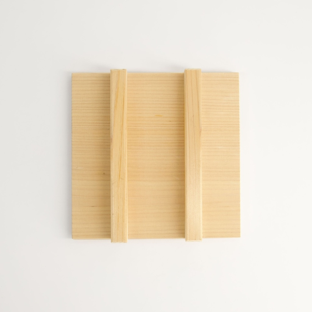 Het ontwerp van het deksel is eenvoudig maar doordacht: een platte houten schijf met twee dwarse handgrepen waardoor het gemakkelijk met één hand vast te pakken en te plaatsen is. Hout geleidt hitte niet zoals metaal, waardoor je snel kunt werken zonder je te verbranden, en het oppervlak absorbeert een deel van het vocht uit het ei, wat bijdraagt aan het drogere, veerkrachtige oppervlak dat kenmerkend is voor een goede tamagoyaki.