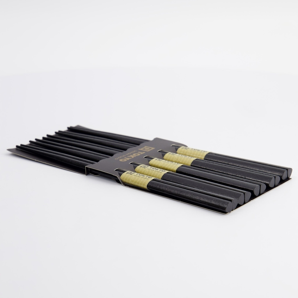 Een elegante set van vijf paar zwarte houten eetstokjes van Tokyo Design Studio, gemaakt met een matte afwerking die zorgt voor een natuurlijke grip en een tactiel gevoel. Het oppervlak is licht geruwd, waardoor de eetstokjes comfortabel in de hand liggen en extra controle bieden bij het pakken van rijst, noedels en kleine gerechten.