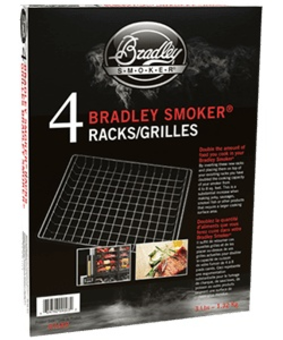 Een set van vier afzonderlijke rekken. Je kunt ze voordelig op de bestaande troggen plaatsen om het oppervlak te verdubbelen. Perfect voor het maken van jerkies, worsten of ander voedsel dat een groot kookoppervlak nodig heeft.