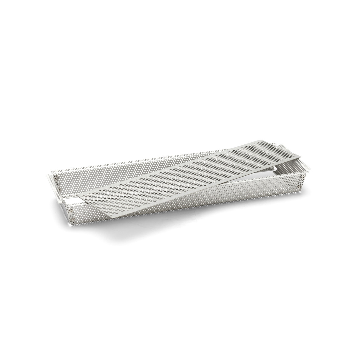 Vorm voor een langwerpige taart of cake. Het geperforeerde oppervlak laat meer lucht door, waardoor je baksels knapperiger worden. Voor echt knapperige dingen kies je best een geperforeerde vorm. De vorm heeft een uitneembare bodem zodat je je product er gemakkelijk uit kunt halen en gemakkelijk kunt schoonmaken. De vorm wordt geleverd met voorgesneden bakpapier met antikleef eigenschappen dat tot 200 keer hergebruikt kan worden, maar je kan er ook in bakken zonder papier. Bestand tegen temperaturen tussen -170°C en +260°C. Ook vaatwasmachinebestendig. De koekjes worden 35 x 10,5 x 3,5 cm, dus de vorm is iets groter. Gemaakt van roestvrij staal.
