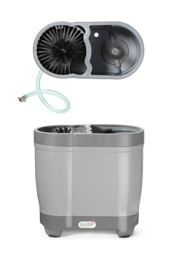 De glassenwasmachine wordt in het aanrecht gemonteerd en wast glazen snel met koud water. De ene bak heeft drie roterende borstels voor reiniging met afwasmiddel; de andere heeft een mondstuk dat schoon spoelwater tegelijkertijd op de binnen- en buitenkant van het glas spuit. Glazen kunnen direct na reiniging worden gebruikt.