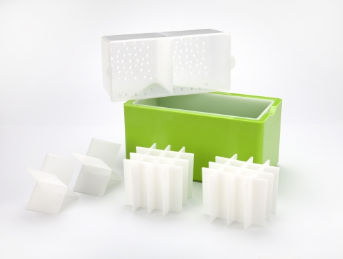 Aan de onderkant van de vorm bevindt zich een 'net' waar de ijsblokjes bevriezen terwijl het onzuivere water zich daaronder verzamelt. Met de juiste timing kun je de ijsvorm verwijderen voordat deze bevroren is, anders kun je hem gewoon achteraf verwijderen.