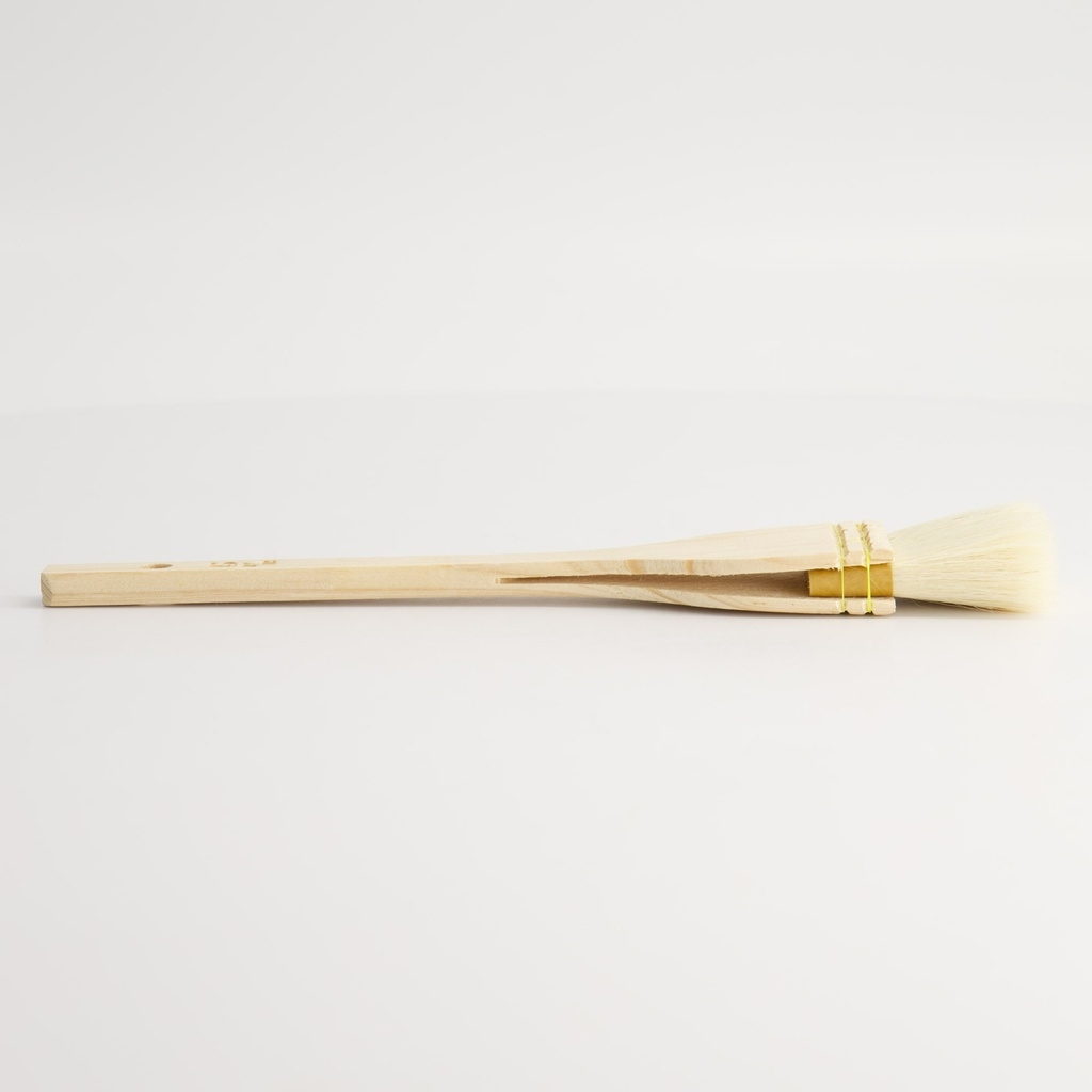 Een klassieke Japanse kookkwast, uchiwa bashi, gemaakt van handgebonden geitenhaar en een onbehandeld houten handvat. De borstel wordt traditioneel gebruikt om tare (saus) op gegrilde spiesjes zoals yakitori of kushiyaki te kwasten, maar werkt net zo goed voor glaceren, oliën van gietijzer of bakken.