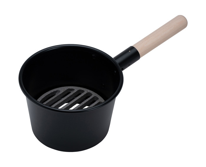 De houten handgreep maakt het mogelijk de pan te verplaatsen, zelfs als deze heet is, en het hoge, rechte wandprofiel houdt de sintels bij elkaar terwijl de luchttoevoer door de opening op natuurlijke wijze wordt geregeld.