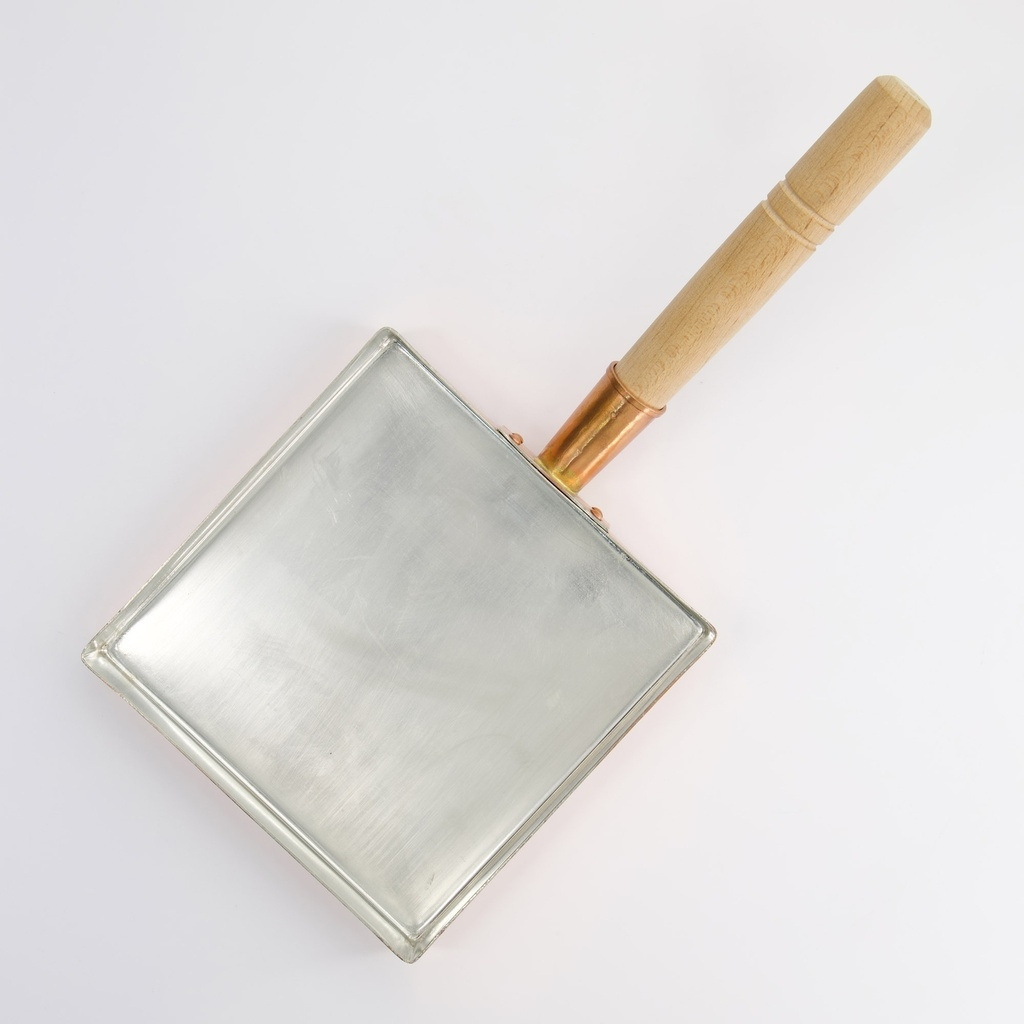 De vorm is vierkant voor rechte randen en een gelijkmatig resultaat, maar de echte kwaliteit van de pan zit in het materiaal. Koper geleidt warmte beter dan elk ander metalen materiaal en zorgt voor een gelijkmatige, gecontroleerde temperatuur over het hele oppervlak, waardoor het eibeslag langzaam kan stollen zonder te verbranden of uit te drogen.