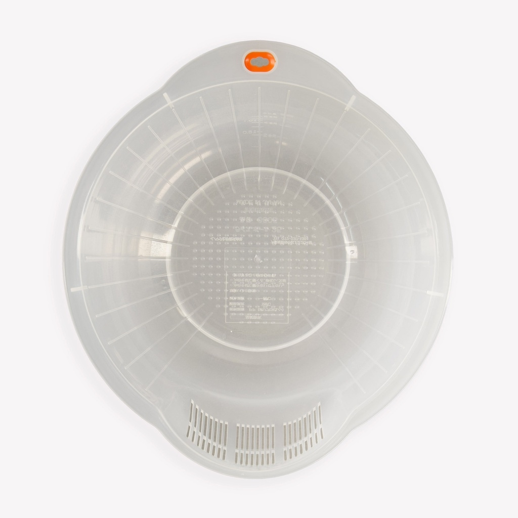 Dit Japanse model van doorzichtig plastic heeft een ingebouwd zeefje met fijnmazige drainagegroeven waardoor het water snel wegloopt zonder dat er ook maar één korrel verloren gaat. De vorm maakt het gemakkelijk om de rijst in het water te laten circuleren - de beweging die het zetmeel losmaakt en dat schone, kenmerkende resultaat geeft zodra de rijst gaar is.