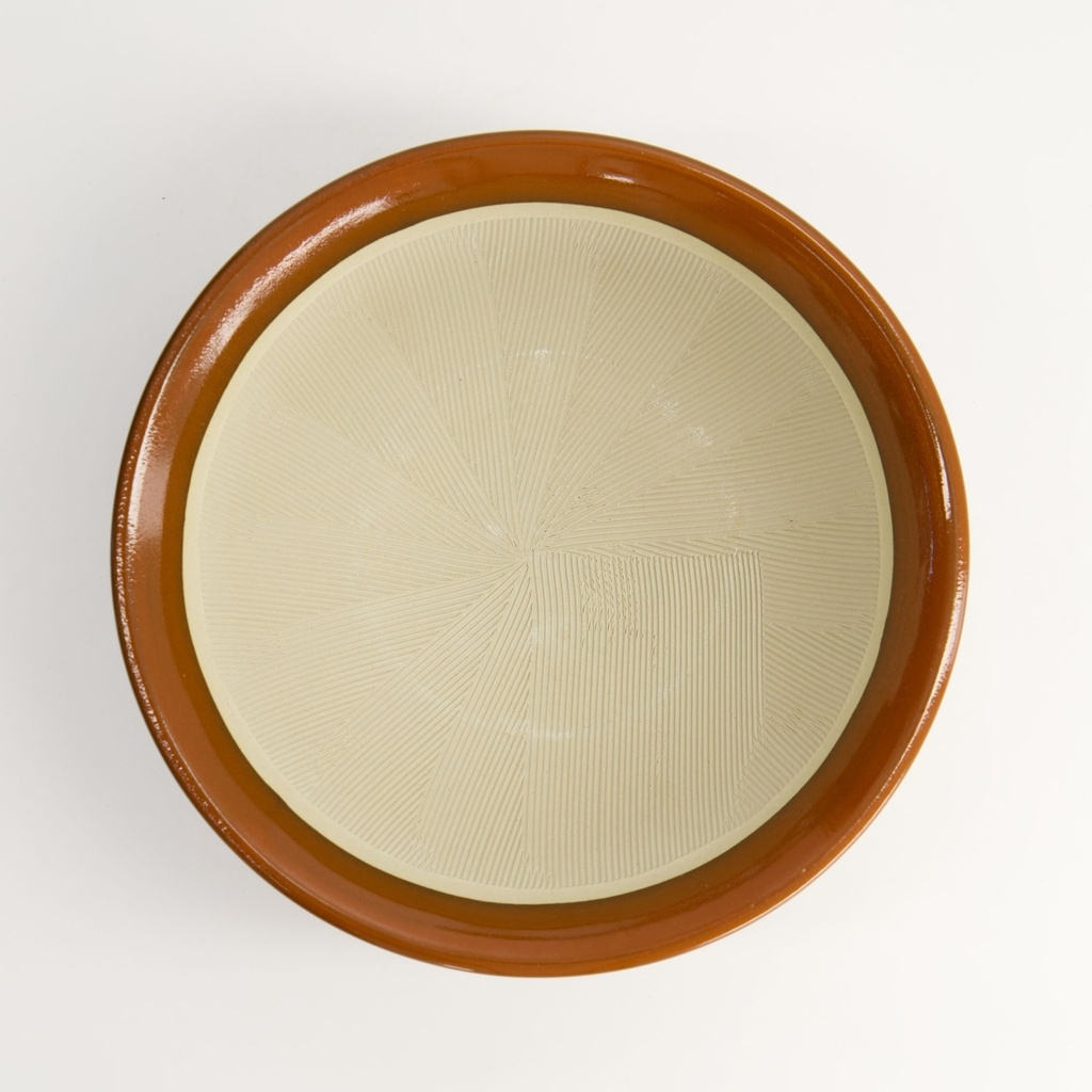 Deze Japanse vijzel, suribachi genaamd, is gemaakt van geglazuurd keramiek met interne groeven waardoor hij ideaal is voor het fijnmalen van zaden, noten en specerijen. Het traditionele bruine glazuur en de lichtgekleurde binnenkant geven de vijzel een klassieke uitstraling die zowel in professionele keukens als in keukens thuis tot zijn recht komt.