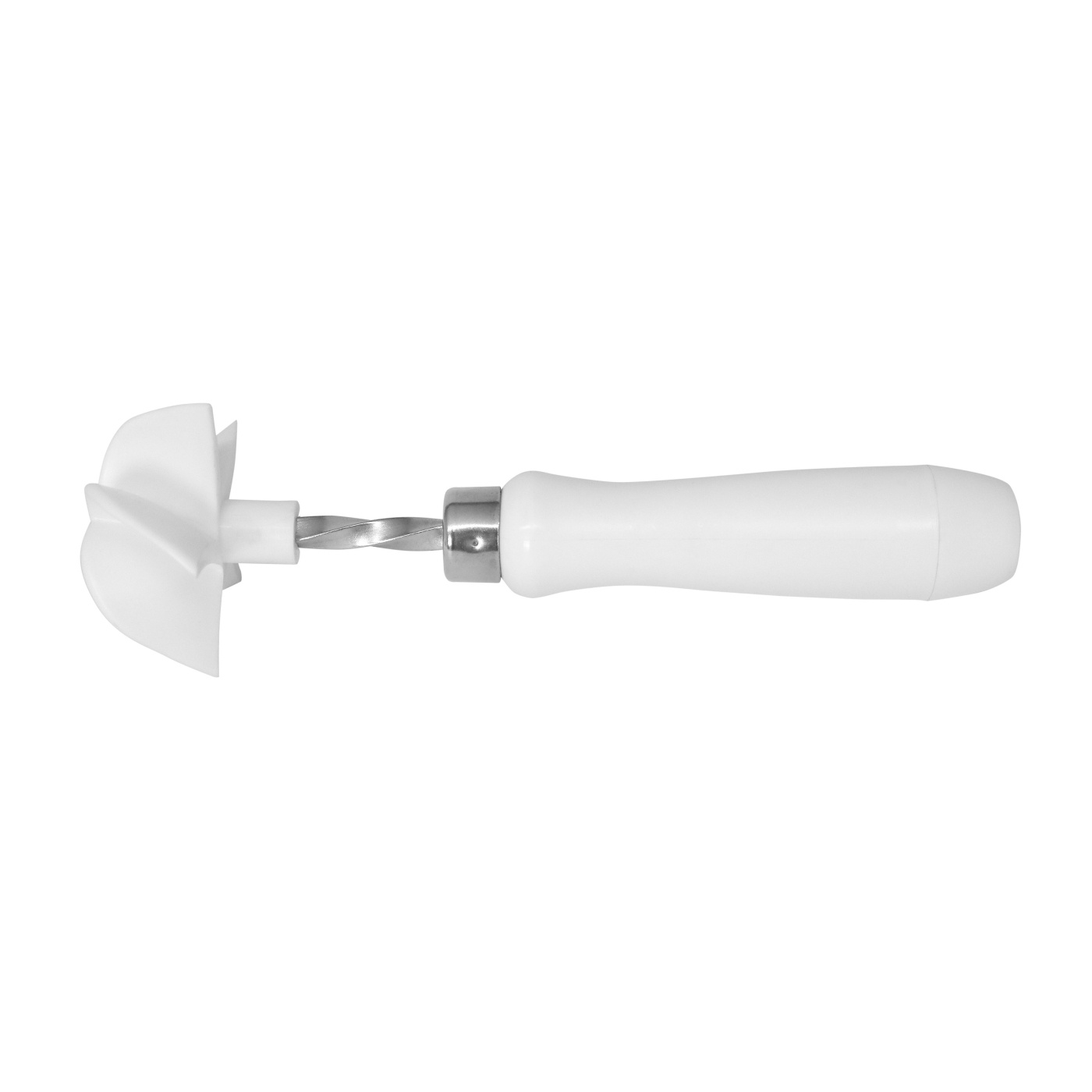 Handstempel met handvat van polypropyleen en stempelkop van polyethyleen. Wordt gebruikt voor het indrukken van kaiserbroodjes. De stempeldiameter is 64 mm, afgestemd op de standaardmaat voor broodjes van ongeveer 50-70 gram deeggewicht. Het gereedschap wordt tegen het afgeronde deegstukje gedrukt en geeft het karakteristieke patroon dat het oppervlak in vijf segmenten verdeelt.