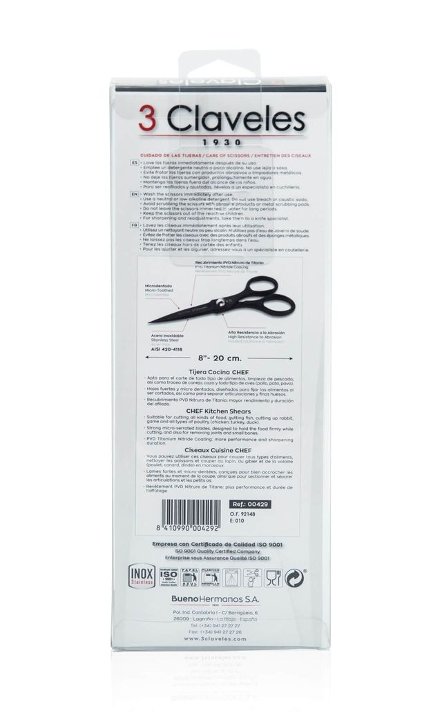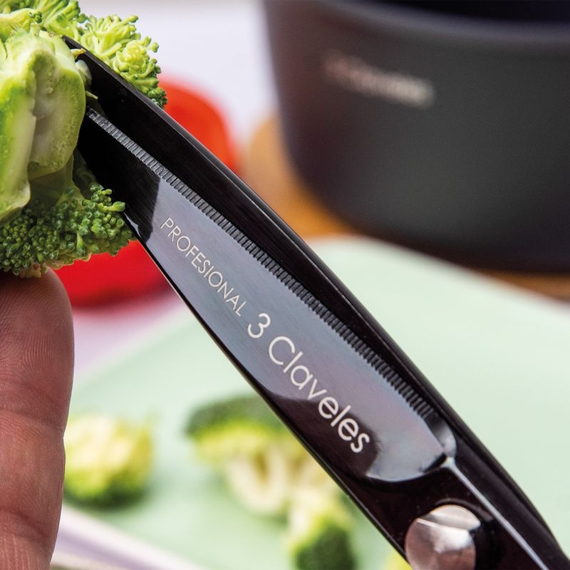 Deze keukenschaar van 3 Claveles is niet zomaar een hulpmiddel, maar een verlengstuk van je hand wanneer het gaat om nauwkeurige en repetitieve bewerkingen in een professionele keuken. Hij is vervaardigd uit roestvrij staal met een warm gesmede constructie, wat zorgt voor een stabiele en torsiestijve schaar die zijn vorm en scherpte behoudt, zelfs onder zware belasting. Elke opening en sluiting voelt direct en gecontroleerd aan, zodat je met het product werkt en niet ertegen.