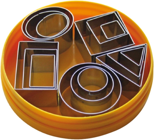 Uitstekerset met 15 geometrische vormen in roestvrij staal, hoogte 20 mm, materiaaldikte 0,3 mm. In de patisserie worden de vormen gebruikt om fondant, marsepein en suikerdeeg uit te steken in precieze geometrische details. In de fine dining zijn ze even thuis: een terrine op kamertemperatuur, een gestold geperst groentblad, een plak aspic of een dunne carpaccio wordt direct op het bord in exacte geometrieën gesneden zonder vrijhandwerk. De scherpe rand van 0,3 mm staal geeft een schone snede die delicate bereidingen niet samenperst. Vaatwasserbestendig en stapelbaar.