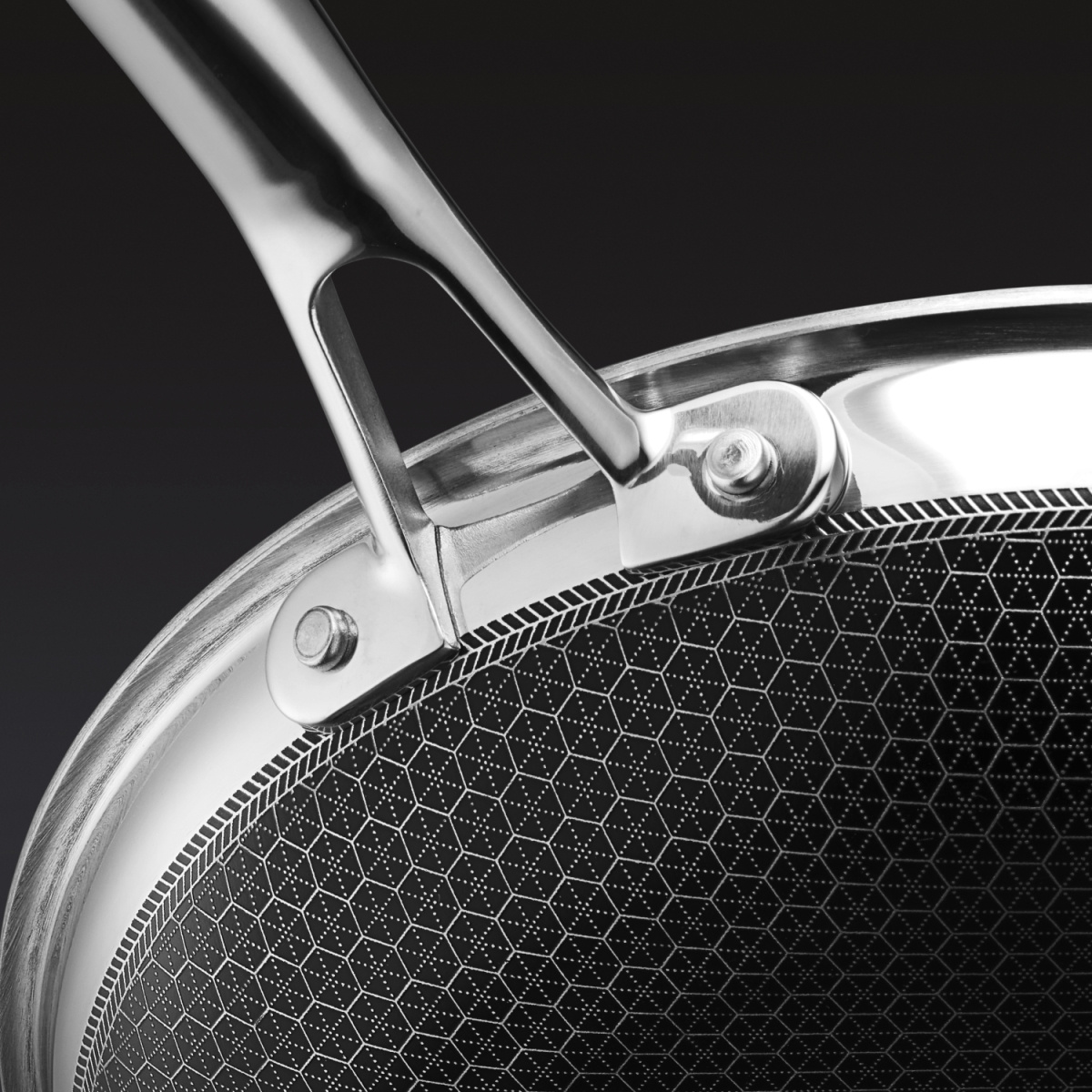 Het gepatenteerde oppervlak met zeshoekig patroon bestaat uit roestvrijstalen bovenkanten die zorgen voor een perfect gebruind oppervlak en antiaanbakdalen waardoor het voedsel gemakkelijk loslaat en soepel schoon te maken is. De drielaagse bodem met magnetische kern van roestvrij staal en aluminium zorgt voor een snelle, gelijkmatige warmteverdeling over het hele kookoppervlak - zelfs als de pan vol is.