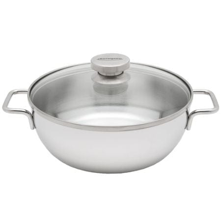Topkwaliteit roestvrijstalen braadpan met deksel van het Belgische Demeyere. De pan bestaat uit 7 lagen roestvrij staal en aluminium tot aan de rand, waardoor hij uitstekende braad- en verwarmingseigenschappen heeft. Het ontwerp zorgt voor een zachter kookproces en is perfect voor zuivel- en meelproducten.