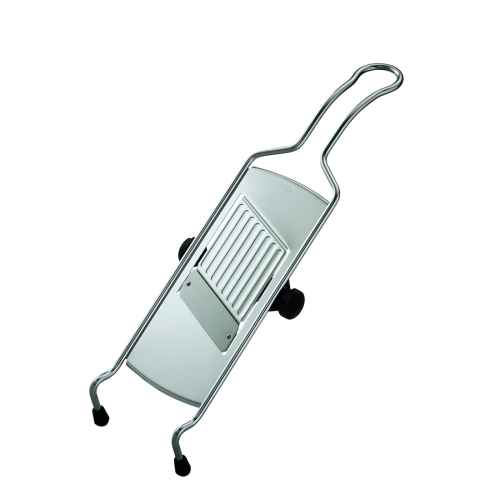 Roestvrije mandoline van Rösle met verstelbaar blad. Kleine siliconen voetjes zorgen ervoor dat hij stabiel op de werkbank staat.
