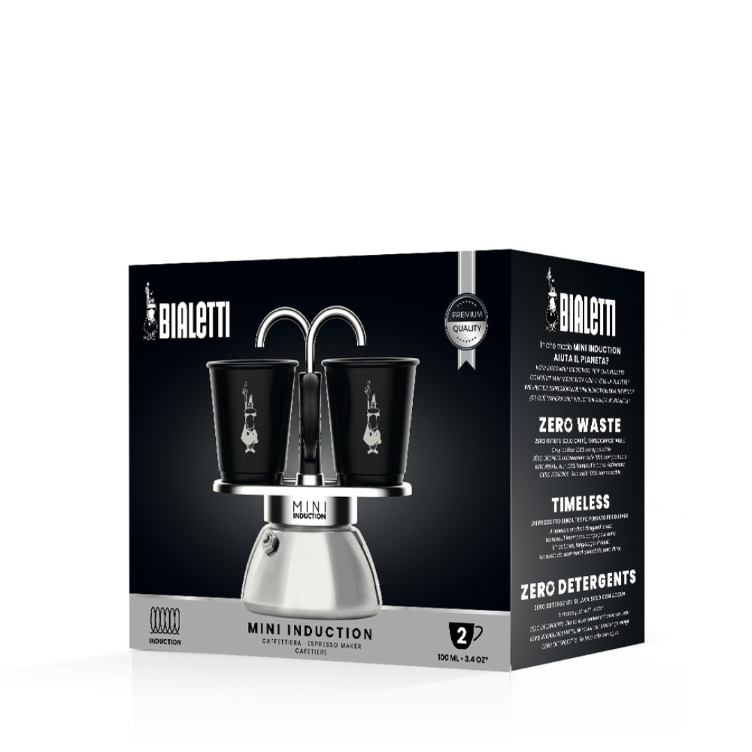 Mooie mokka maker voor het maken van twee espresso's rechtstreeks in het kopje. Het model is geschikt voor inductie, zoals de naam al doet vermoeden. Schroef de bodem los en vul water tot aan het ventiel. Vul met koffie zonder te knijpen, duw alles samen en zet op de kookplaat met de kopjes onder de tuitjes en je hebt snel je fix. De kopjes zijn inbegrepen in de verpakking.