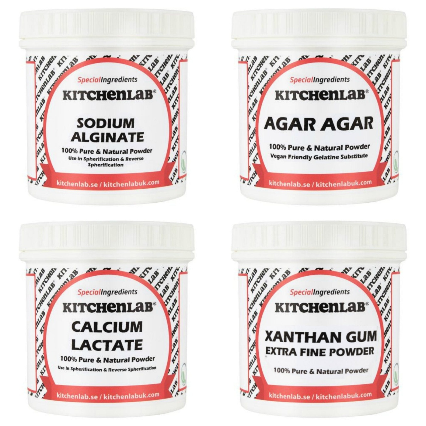 Deze set bevat vier ingrediënten om je op weg te helpen met moleculaire gastronomie. De niet-ingewijden zullen versteld staan van wat er allemaal mogelijk is met eenvoudige recepten en deze vier stoffen.