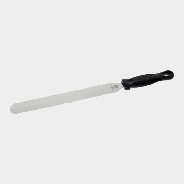 Groot getand paletmes in koolstofvezel design uit de FKOfficium serie van de Buyer. Robuuste en solide kwaliteit in zowel het X20CR13 roestvrij staal als het ergonomische handvat. Gebruik het bijvoorbeeld om taartbodems te splitsen of om de vulling op je gebak te verdelen. Afmetingen: 25 cm lang lemmet / 39,5 cm lang / 3,5 cm breed 35 cm lang lemmet / 50 cm lang / 3,5 cm breed