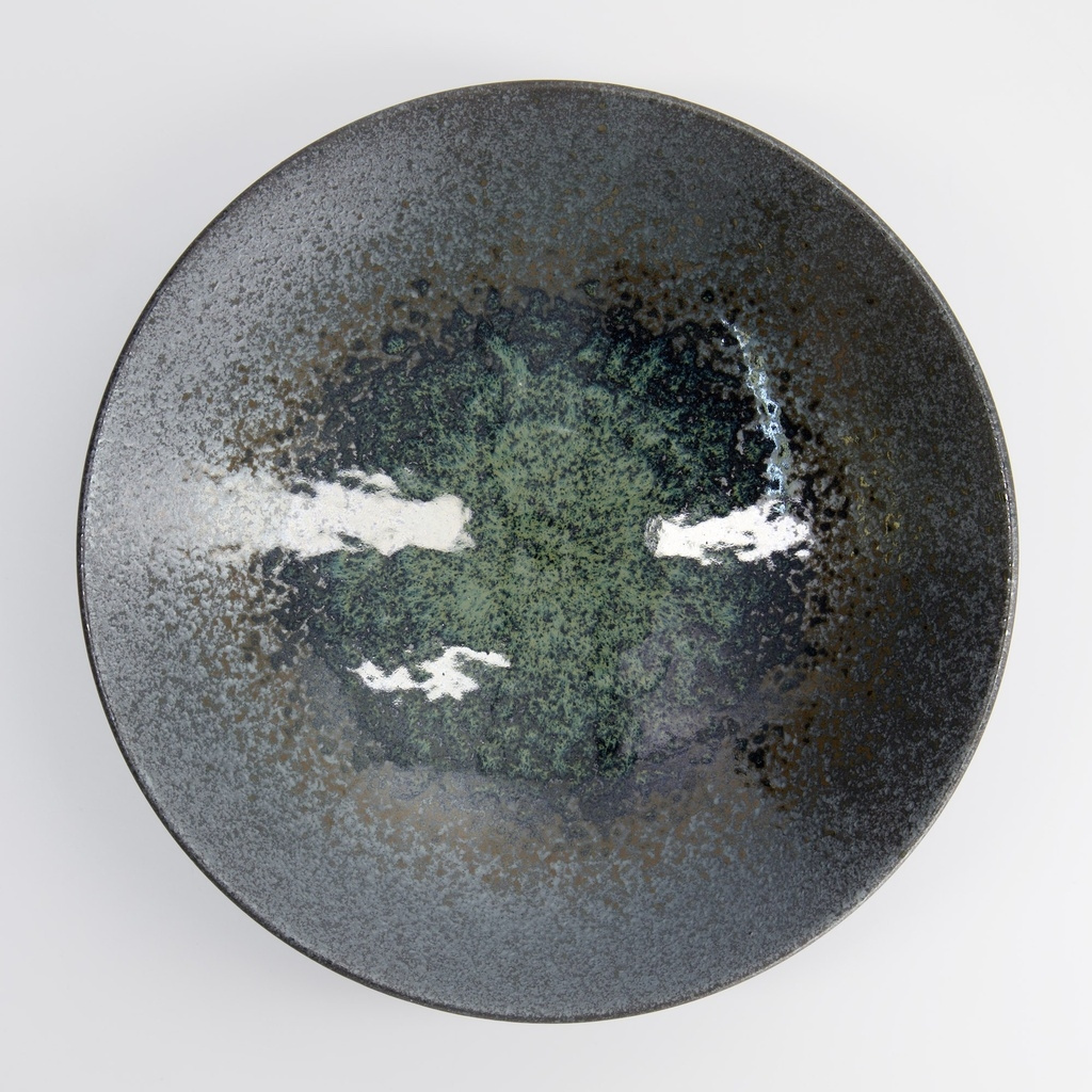 Het glazuur is levendig en reactief, waardoor elke kom een unieke variatie in toon en textuur heeft, soms meer metallic, soms zachter en groener. Het contrasterende matte oppervlak tegenover de gladde binnenkant maakt de kom net zo geschikt voor ramen als voor donburi, salades of het serveren van warme gerechten in de moderne gastronomie.