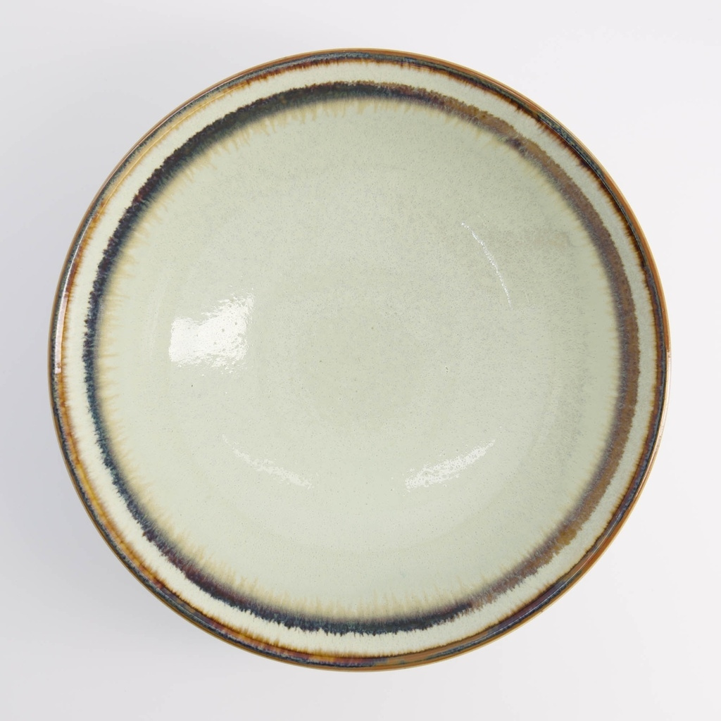 Deze ramenkom, Wasabi, heeft een zachtgroen glazuur dat in toon verschuift van licht jade naar dieper olijfgroen met subtiele vleugjes bruin en blauw langs de rand. Het glazuureffect, dat de Japanners yūhen noemen, geeft elke kom een unieke uitdrukking, alsof de kleur levendig over het oppervlak beweegt.