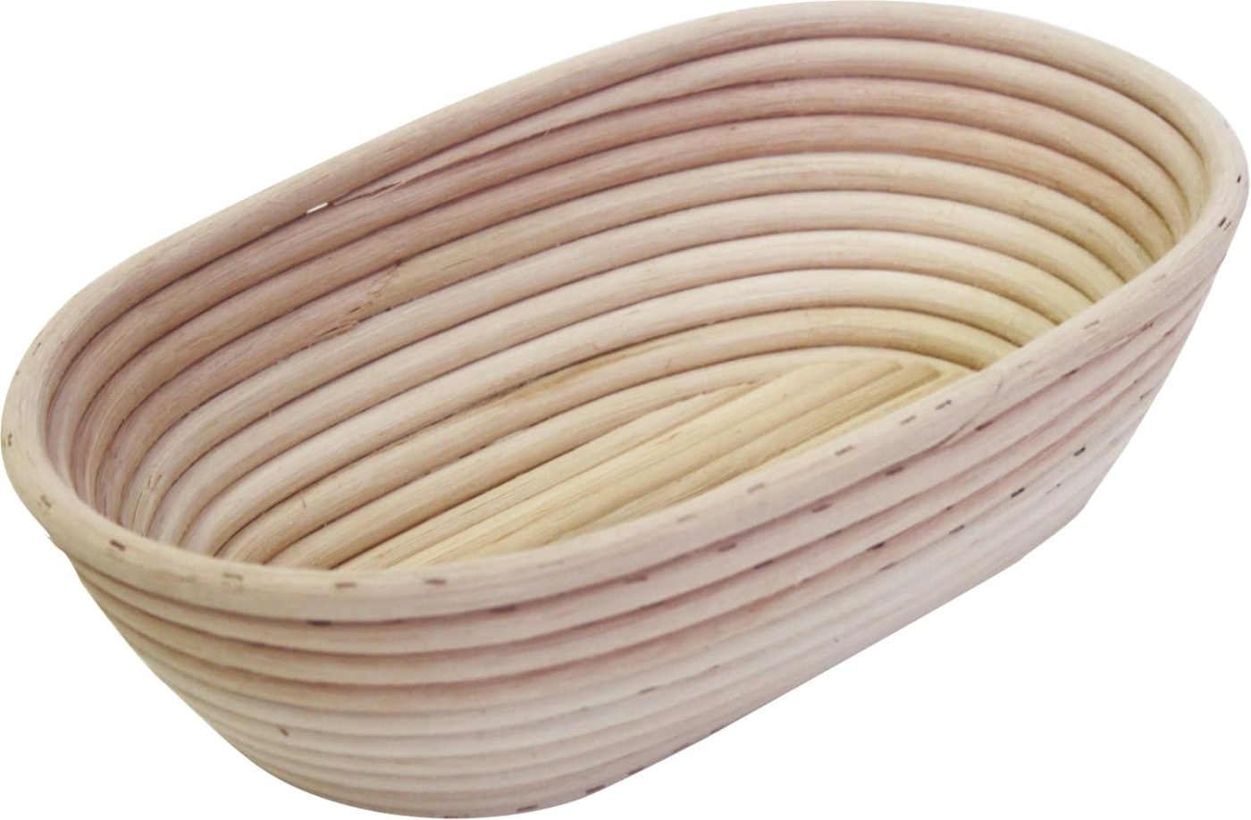 Ovaal rijsmandje van rotan met gevlochten bodem, voor broodjes en langwerpige broden in gewichten van 250 g tot 2000 g. Het natuurlijke rotanmateriaal ademt en reguleert het vocht rondom het deeg tijdens het rijzen, wat een gelijkmatiger resultaat geeft vergeleken met gesloten vormen. De gevlochten bodem drukt een traditioneel mandpatroon in het brood dat na het afbakken duidelijk zichtbaar is.