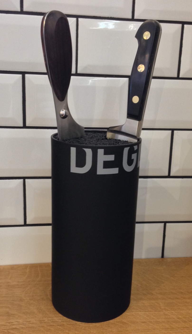 Klein en handig messenrek van het Franse Déglon. Hoewel het rek klein van formaat is, kan het veel messen bevatten, dankzij het feit dat het in plaats van vaste vakken zoals veel andere messenrekken heeft, een binnenkant van plastic rietjes heeft waardoor de messen precies zo in het messenrek kunnen worden geplaatst als jij wilt.