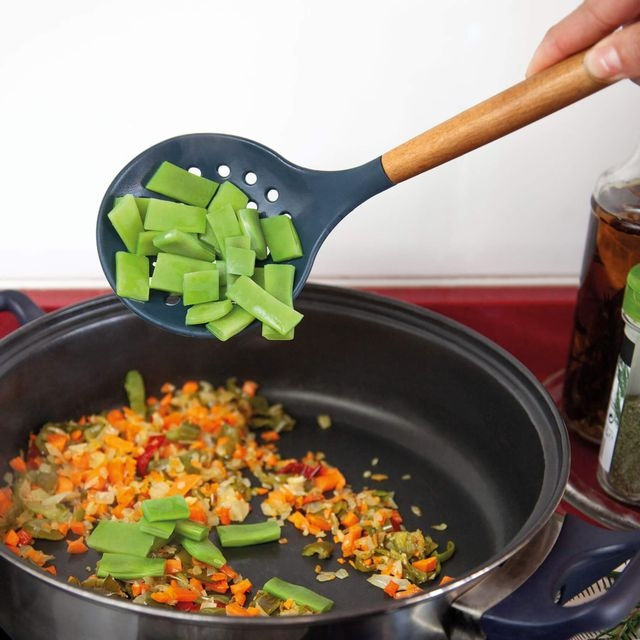 Het siliconen oppervlak is zacht voor je kookgerei en bijzonder geschikt wanneer je pannen met non stick coating gebruikt. Hittebestendig tot 230°C.
