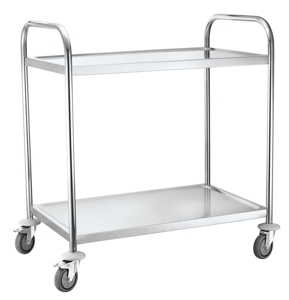 Serveerwagen van roestvrij staal met twee legplanken en dempingsmateriaal onder elke plank dat geluid van borden en vaten vermindert. Maximale belasting 50 kg per plank. Het werkoppervlak meet 830×510 mm en de afstand tussen de legplanken is 550 mm, wat een goede hoogte biedt voor het stapelen van borden of het plaatsen van hogere voorwerpen op de onderste plank.