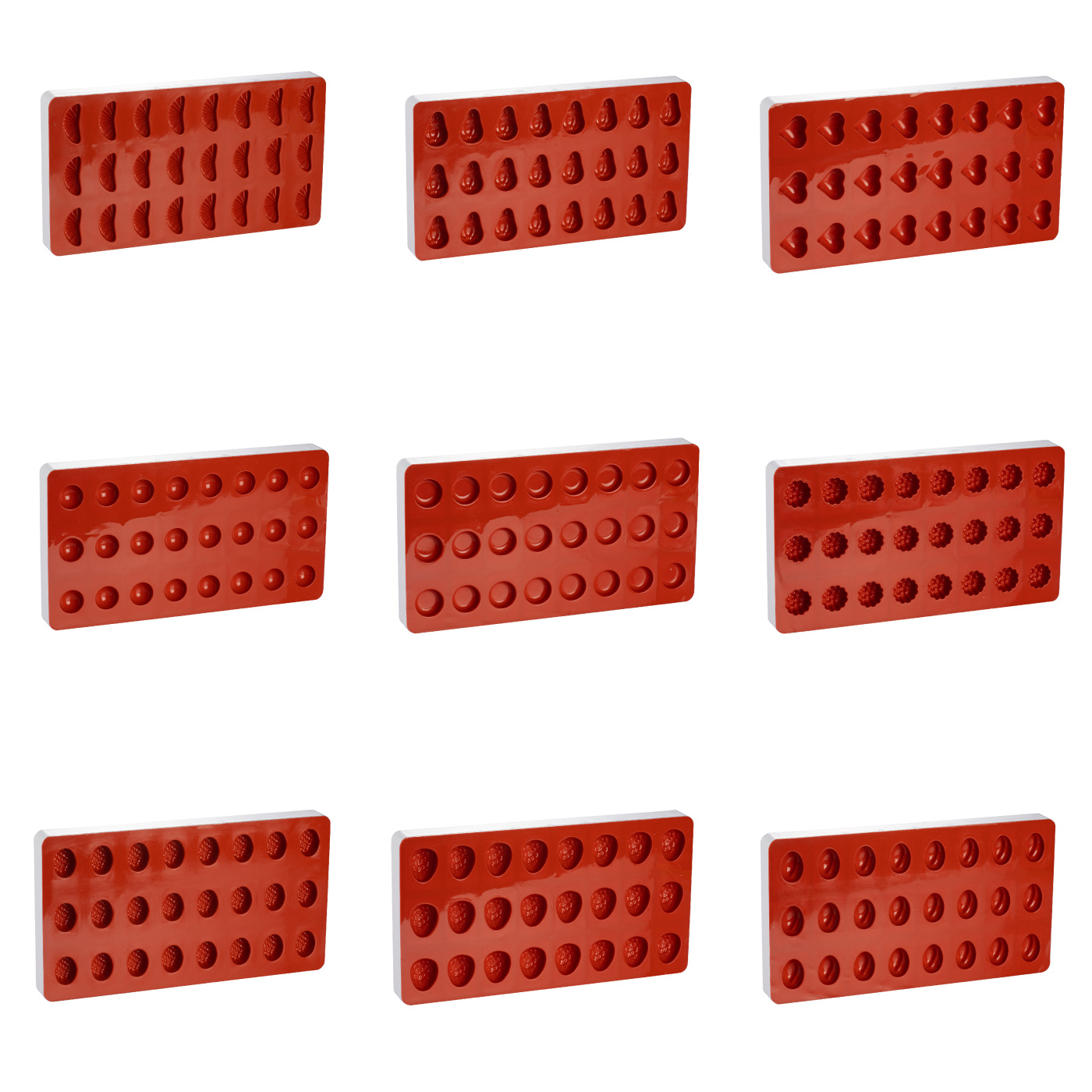Siliconen mal met plastic frame voor het gieten van kleine snoepjes, snoepjes of gelei (voor het gieten van bonbons of pralines raden we plastic pralinevormen aan). De vormen zijn gemaakt van rood siliconen en vormen veel kleine fruitvormige lekkernijen. Pas de smaak aan met behulp van onze smaakdruppels! De vorm is 18 x 33,5 cm. Verkrijgbaar in verschillende designs.