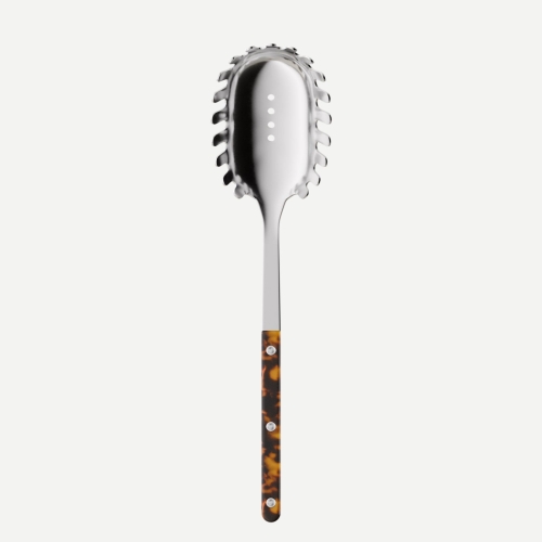 Een klassieke spaghettilepel met uitgesproken karakter en betrouwbare functie. Ontworpen met zowel vorm als functie in gedachten - de afgeronde zeef vangt de pasta op zonder deze te beschadigen en het handvat biedt een stevige grip, zelfs als het druk is in de keuken. Gemaakt van 18/10 roestvrij staal met het kenmerkende Bistrot nylon handvat. Een opscheplepel die zich net zo goed thuisvoelt in een rustieke bistro als in een alledaagse pastaliefhebber. De stijlvolle handgrepen zijn hier voorzien van een schildpadpatroon in bruintinten.