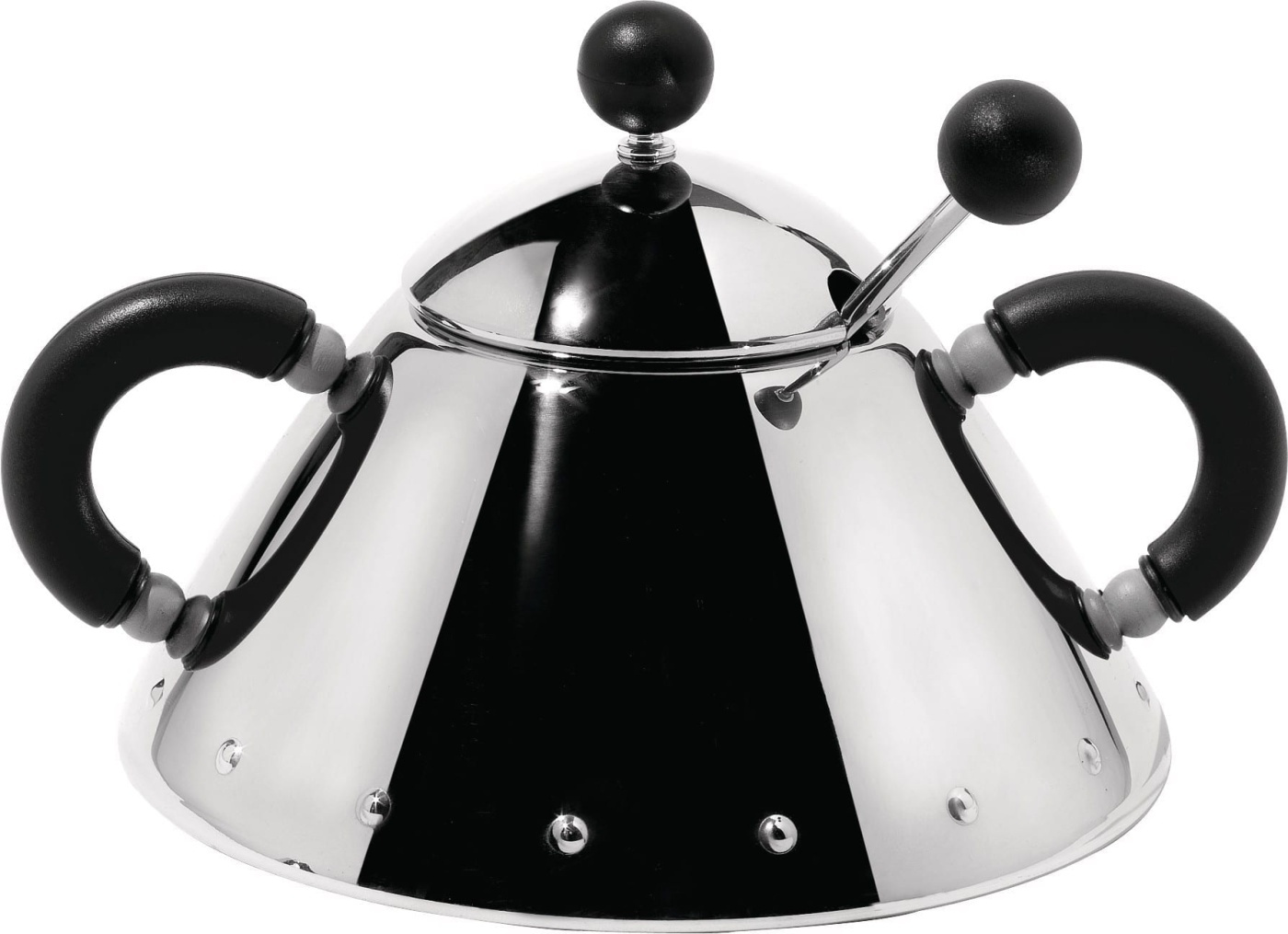 Suikerpot met lepel in hoogglans 18/10 staal. Voor 20 cl, Ø 10,5 cm, hoogte: 8 cm Ontwerp: Michael Graves