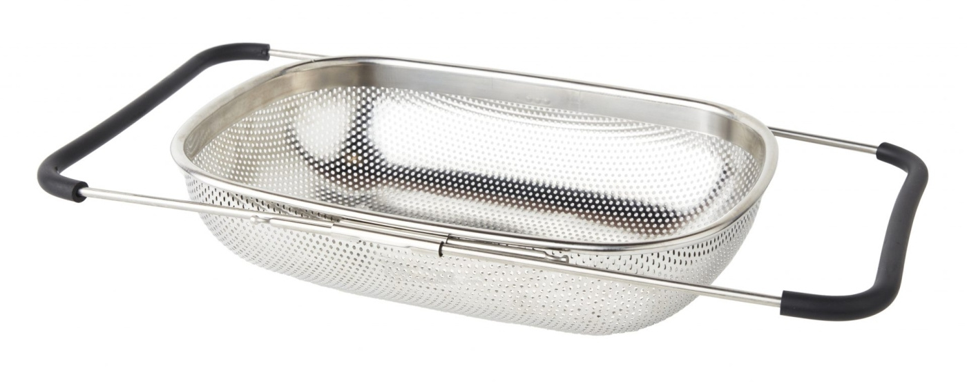 "Een praktisch verstelbaar vergiet dat op alle gootstenen past. Handig voor het afgieten van pasta, het afspoelen van salade of voor het opvangen van aardappelschillen tijdens het schillen.