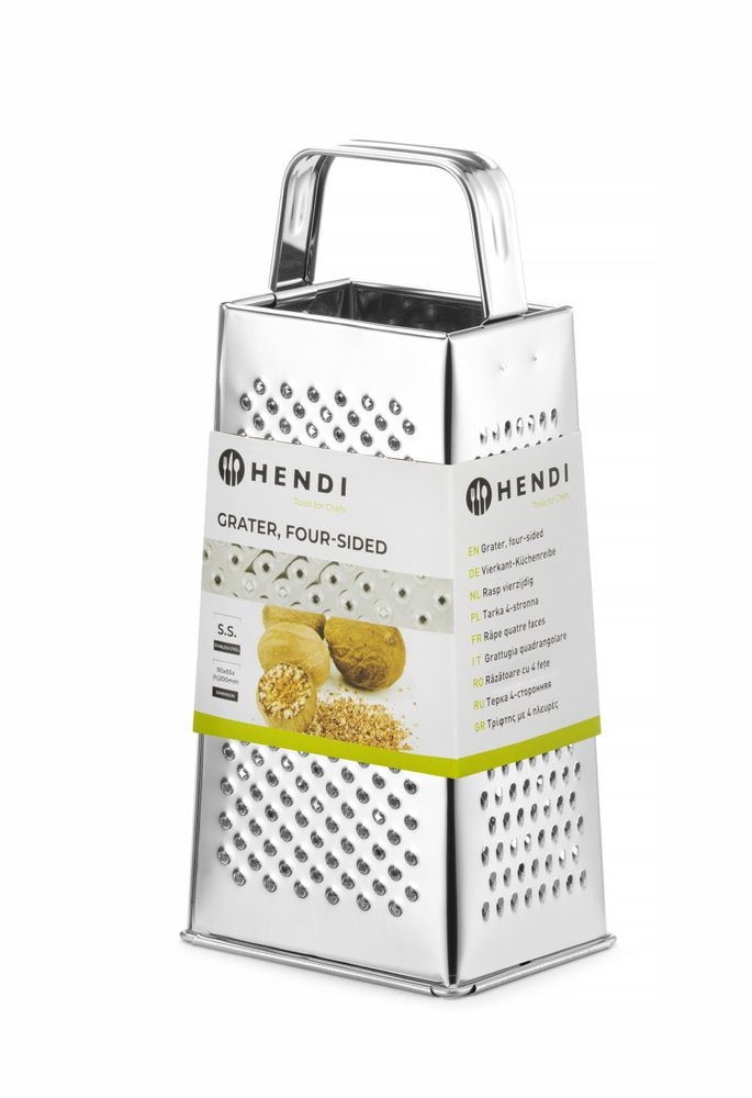 Een vierkante roestvrijstalen rasp met verschillende rasppervlakken op elke kant voor grof, middelfijn en fijn geraspte ingrediënten. Degelijk uitgevoerd, compact formaat 90×65×200 mm. Vaatwasserbestendig.