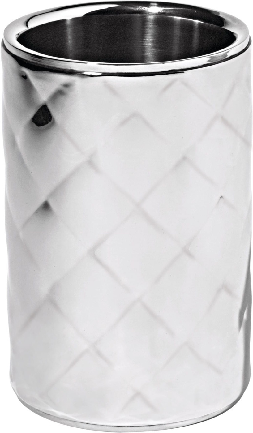 Dubbelwandige wijnkoeler in hoogglans 18/10 staal met een quiltpatroon. Geschikt voor één fles. Hoogte: 18 cm, Ø 12,5 cm Ontwerp: LPWK en Marta Sansomi