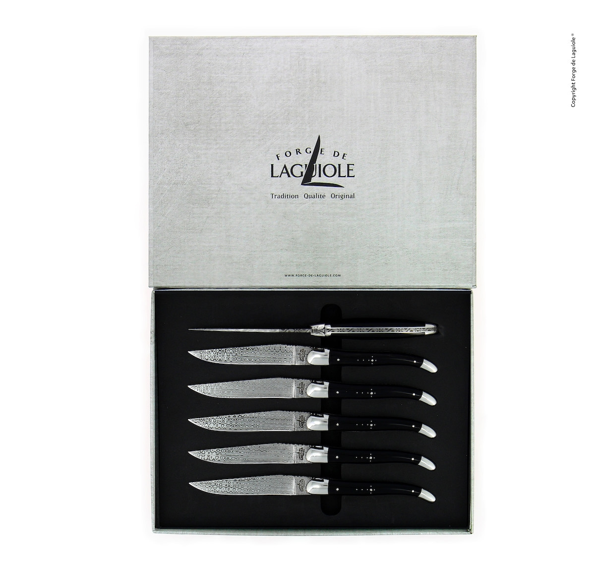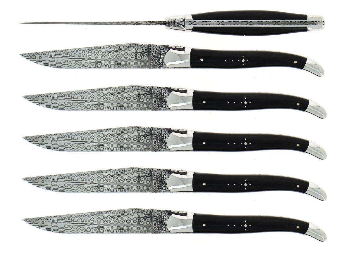 Zes messen, Donker hoornen handvatten, gedamasfalteerd, Collectie - Forge de Laguiole
