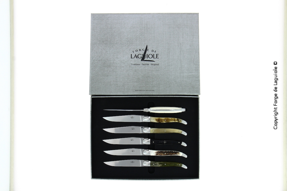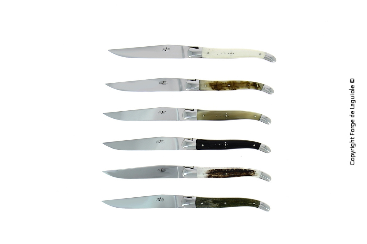 Zes messen, handvatten van verschillende dierlijke materialen, gepolijst, Tradition - Forge de Laguiole