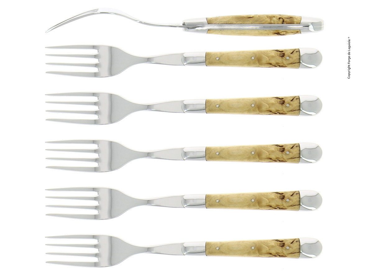 Zes vorken, Berkenhouten handvat, gepolijst, Tradition - Forge de Laguiole