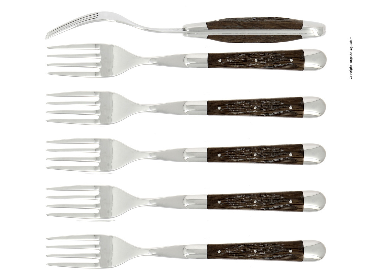 Zes vorken, handvat van versteende eikenschors, gepolijst, Tradition - Forge de Laguiole