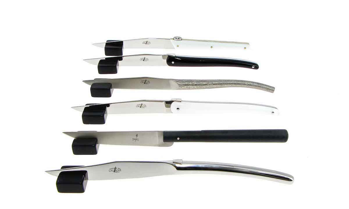 Boterbelasting om je Forge de Laguiole dinermes op een stijlvolle manier te presenteren. Als het mes in het rek zit, wordt de achterkant naar boven gedraaid en worden de bij en de versiering op de achterkant van het mes aan het diner gepresenteerd.